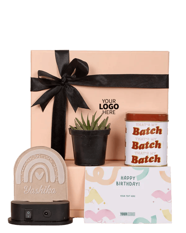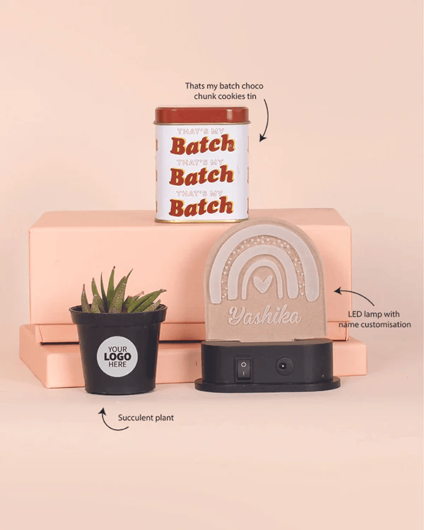 That's My Batch Choco Chunk Cookies 120 g Succulent Plant with Black Pot (4 x 4 x 4 inch) Customized LED Name Lamp (Acrylic Glass Size:- 3.5 x 3.5 inch) Happy Birthday Greeting Card With Your Message Reusable Black/Beige Kappa Board Gift Box, 10 x 8 x 4 inch
