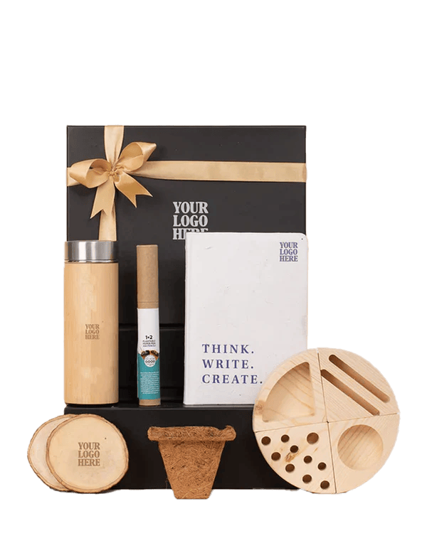 Bamboo Flask with Logo Engraving 450 ml Wooden Desk Organizer (Set of 4 pcs, Size : 6inch ) Plantable Stationery Set( 2 Pens and 1 Pencil) Wooden Coasters Set of 2 pcs ( Size : 3 inch ) Seed Cover Notebook With Your Logo ( Size : A5, 200 pages ) Grow-It-Yourself Planting Kit Greeting Card with Your Logo and Message Reusable Black Kappa Board Gift Box, 12 x 8 x 4 inch