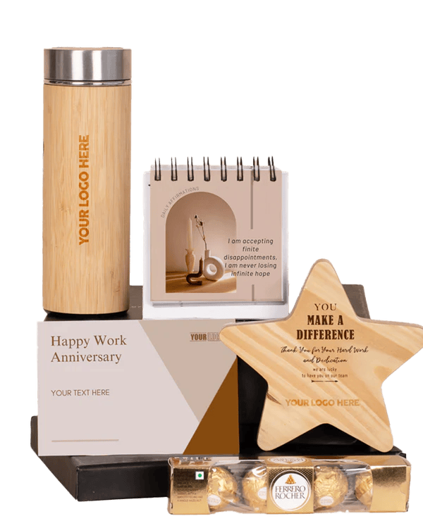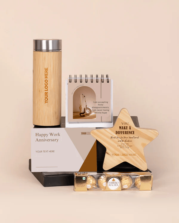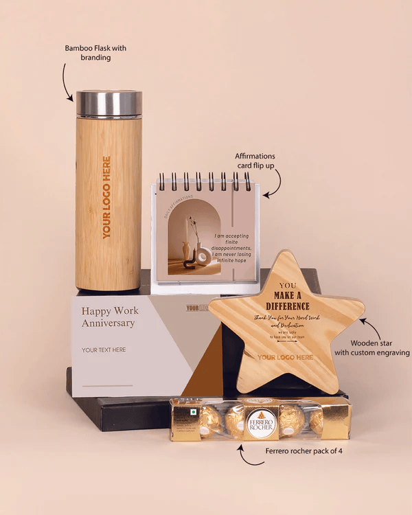 Custom Logo Printed Wooden Star ( Material - Pinewood, Size - 4 inches) Table-Top Affirmation Card Flip-ups ( Size - 4 x 5 x 2.5 inch, 31 Flip-ups) Bamboo Flask with Logo Engraving 450 ml Ferrero Rocher pack of 4 Greeting Card with Custom Message Reusable Black / Beige Kappa Board Gift Box, 10 x 8 x 4 inch